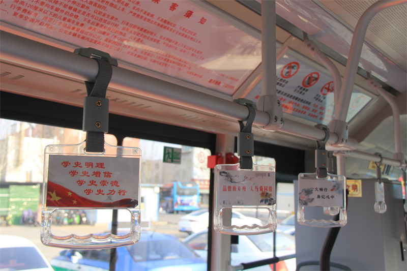 專線聚焦清廉、黨政主題,選取廉政故事、習(xí)近平總書記講話等名言金句,以圖文并茂的形式在4輛公交車車內(nèi)扶手張貼了84張廉政宣傳標(biāo)語,讓市民們?cè)诔俗粫r(shí)感悟“一路正氣,清廉自守”的精神涵義,寓“廉”于“行”。
