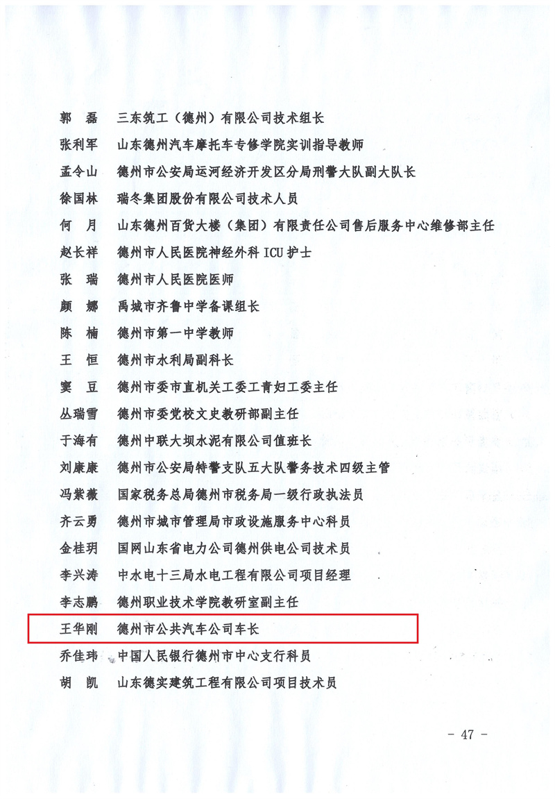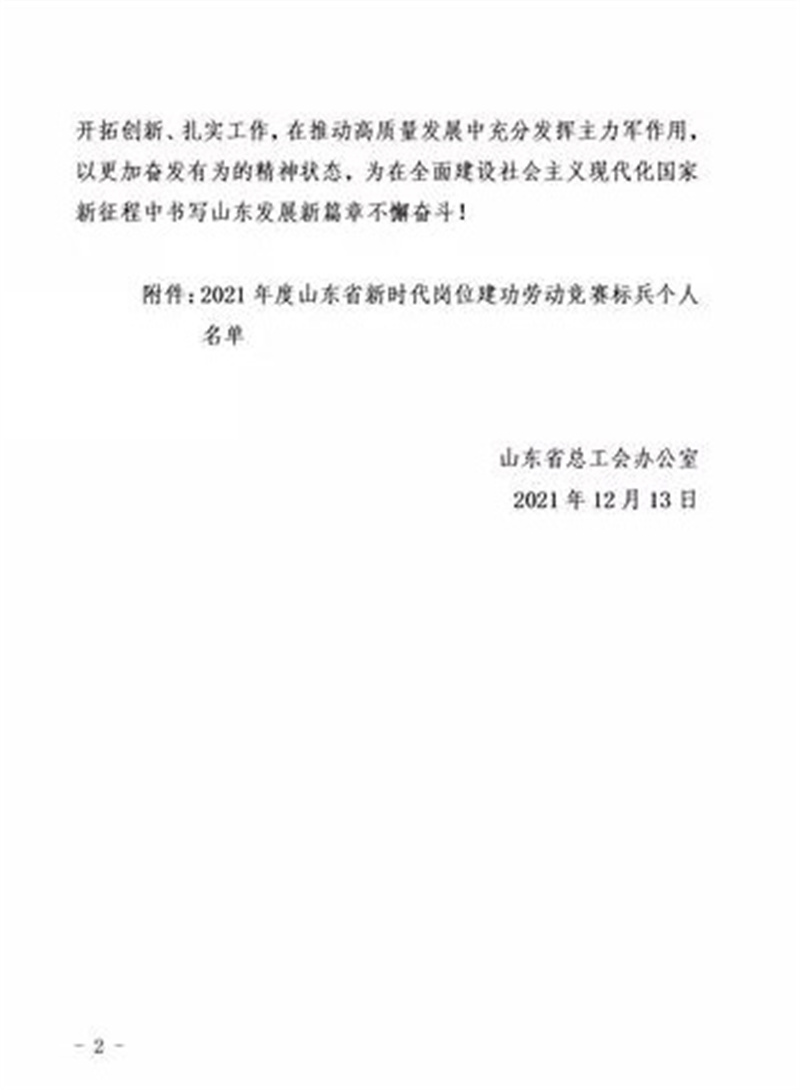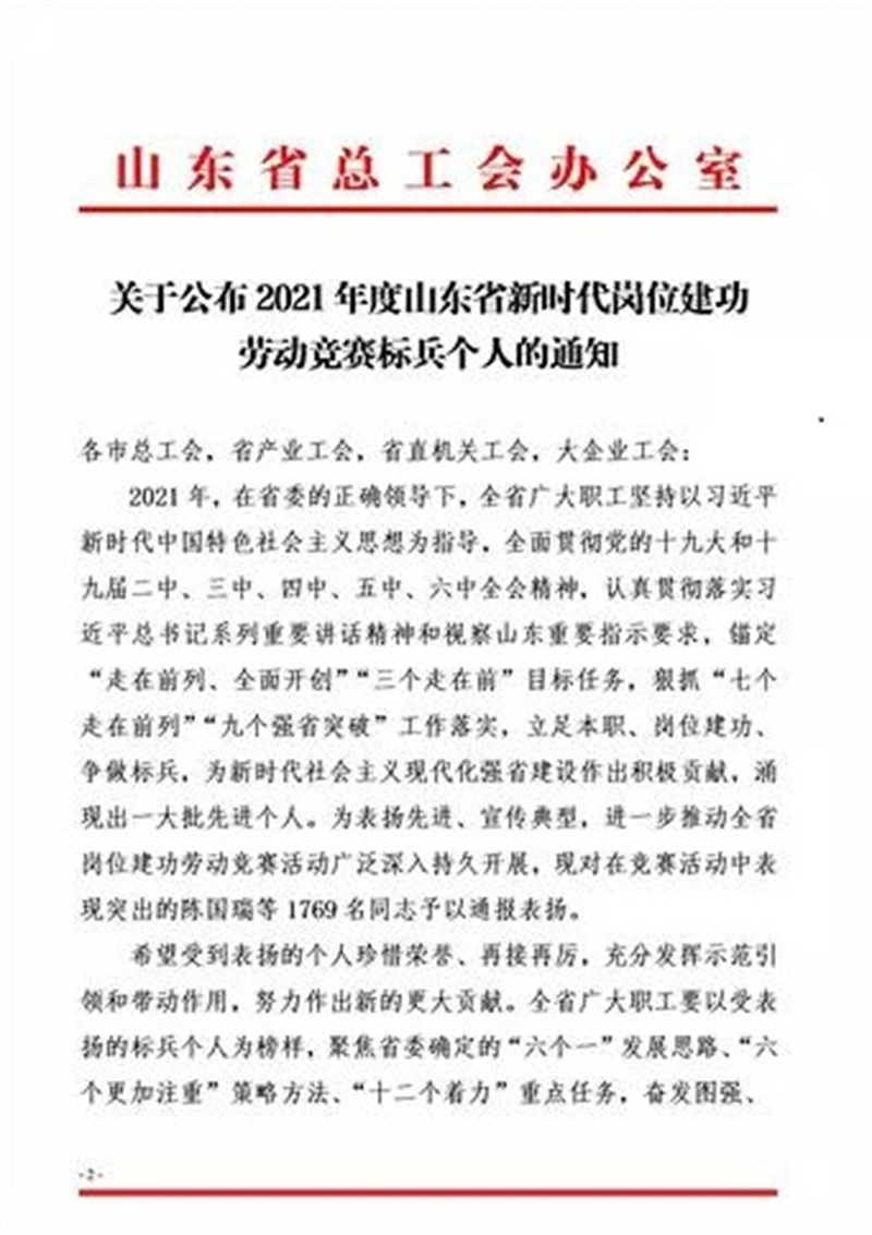 為表?yè)P(yáng)先進(jìn)、宣傳典型,進(jìn)一步推動(dòng)全省崗位建功勞動(dòng)競(jìng)賽活動(dòng)廣泛深入持久開(kāi)展,2021年12月13日,山東省總工會(huì)辦公室發(fā)布《關(guān)于公布2021年度山東省新時(shí)代崗位建功勞動(dòng)競(jìng)賽標(biāo)兵個(gè)人的通知》,德州公交109路王華剛獲2021年度“山東省新時(shí)代崗位建功勞動(dòng)競(jìng)賽標(biāo)兵”榮譽(yù)稱(chēng)號(hào)。