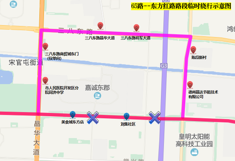 臨時新增:德州晶達(dá)節(jié)能技術(shù)有限公司、陳段新村、三八東路將軍大道、三八東路晶華大道、三八東路商貿(mào)城東門(僅單向)、市人民醫(yī)院開發(fā)區(qū)分院同濟(jì)中學(xué)等6站;