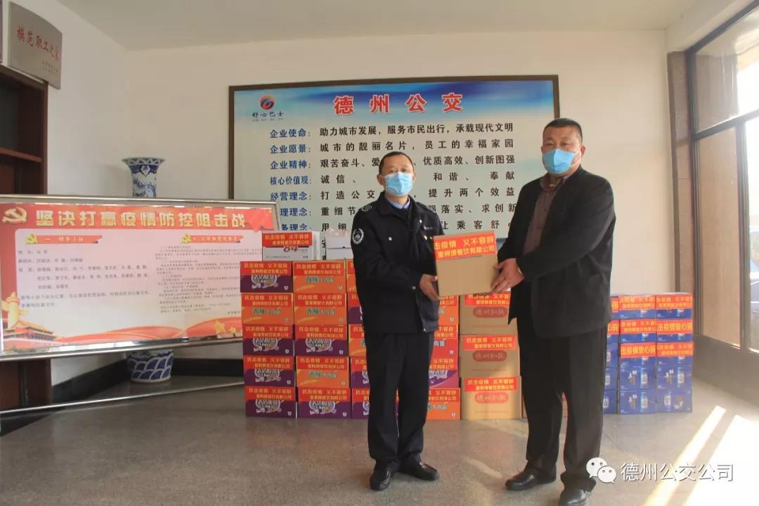 在看到德州公交推送的公交黨員職工在一線防控疫情的新聞稿后,德州董師傅餐飲有限公司總經(jīng)理董海被公交人沖鋒在前、勇于奉獻(xiàn)的精神所感動(dòng)。2月12日,董海總經(jīng)理一行向公交公司贈(zèng)送了護(hù)目鏡、消毒液、酒精、方便面、扒雞等物品,感謝德州公交干部職工在疫情防控工作中舍小家顧大家,為防控疫情所作出的突出貢獻(xiàn),并希望能在這場(chǎng)艱苦的奮戰(zhàn)中貢獻(xiàn)自己微薄的力量。