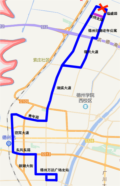 運營路線:德州萬達廣場北站、東地大街、新河路、湖濱大道、新建路、新湖大街、東風(fēng)路、迎賓大街、青年路、湖濱大道、佳納北路、福盛路、德州紅湖老年公寓;