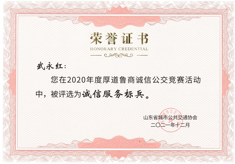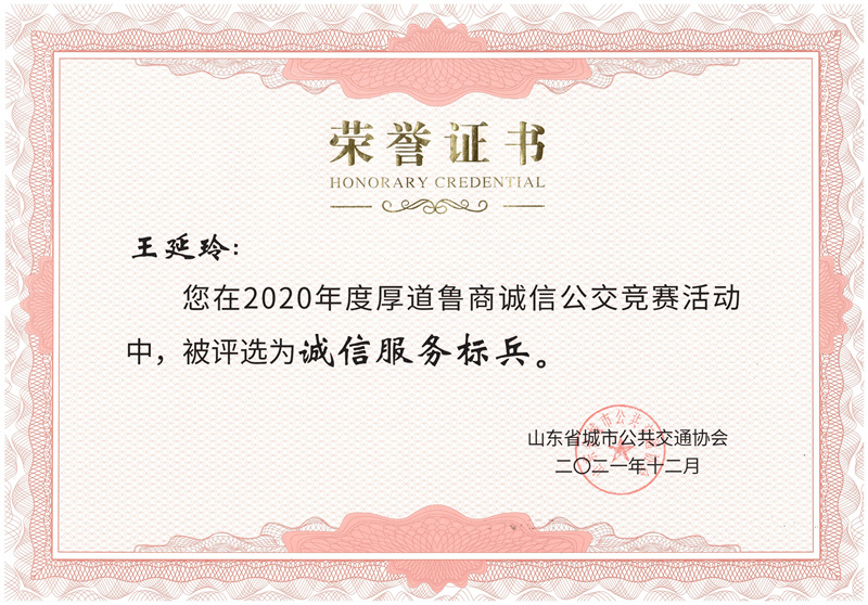 王延玲、武永紅榮獲2020年度厚道魯商誠信公交競賽活動“誠信服務標兵”稱號