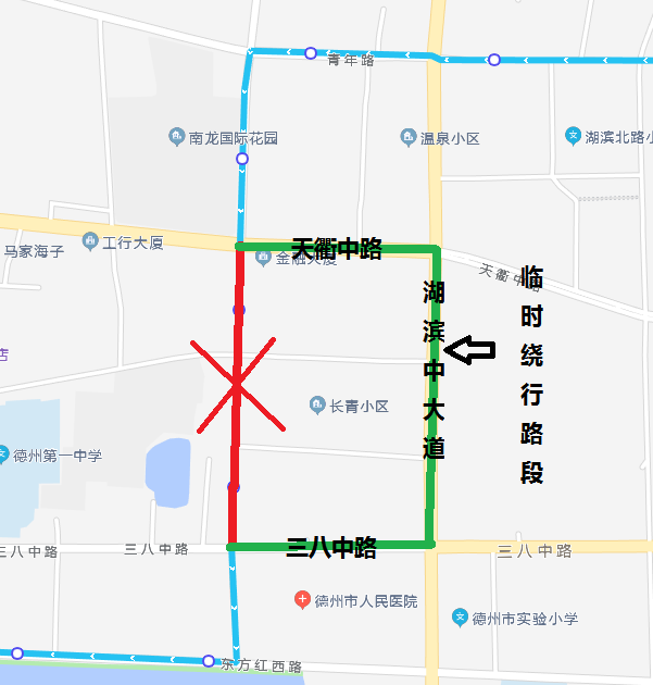 由長河小區(qū)發(fā)車,沿原線路運行至天衢路與新湖大街交叉口左轉(zhuǎn)天衢路,沿天衢路、湖濱大道、三八路,運行至三八路與新湖大街交叉口左轉(zhuǎn),恢復(fù)原線路運行。臨時取消新湖北大街青龍街、新湖北大街長青街站點。