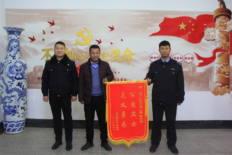隔天,高先生來到一分公司辦公室找到了幫助他救火的33路駕駛員梁洪超,一邊感謝他的熱心幫助,一邊把一面印有“公交衛(wèi)士 見義勇為”的錦旗送到他的手中。