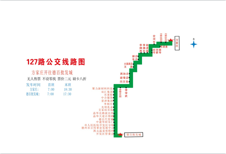 2、站點設(shè)置:方家莊、方家莊東站、方家莊西站、蘇家庵、岔河東、岔河南、冷家寺、趙虎鎮(zhèn)、李牌東、李牌西、郝莊、車莊、大高家店、王英、西孫莊、避雪店、閆王張、李學武、棗林齊北站、聚力新材料科技、雙匯集團、貝萊特、中合服飾、景津集團、李相莊、光明乳業(yè)、艾家坊市場、晶華北路派出所、晶華大道百得路、德百汽貿(mào)城、中建華府東門、市人民醫(yī)院開發(fā)區(qū)分院、德州市公用事業(yè)發(fā)展中心、凱元溫泉度假村、開發(fā)區(qū)管委會、德百批發(fā)城等36處站點。