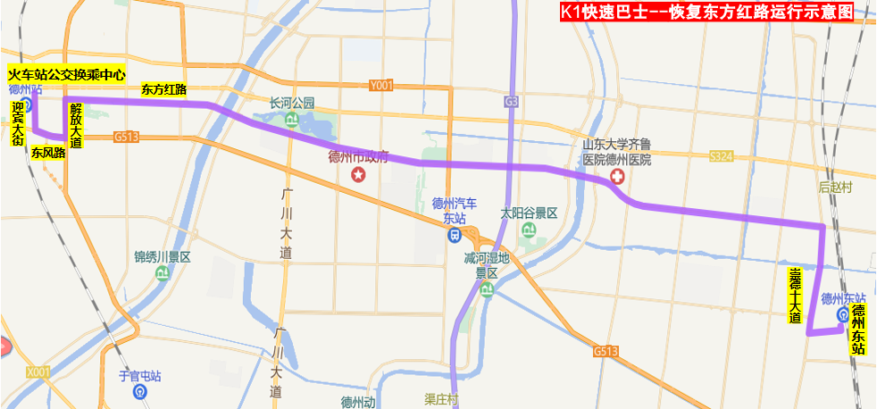 運(yùn)營(yíng)路線:德州東站、車(chē)站南路、崇德十大道、東方紅路、解放大道、東風(fēng)路、迎賓大街、火車(chē)站公交換乘中心,返程亦同;