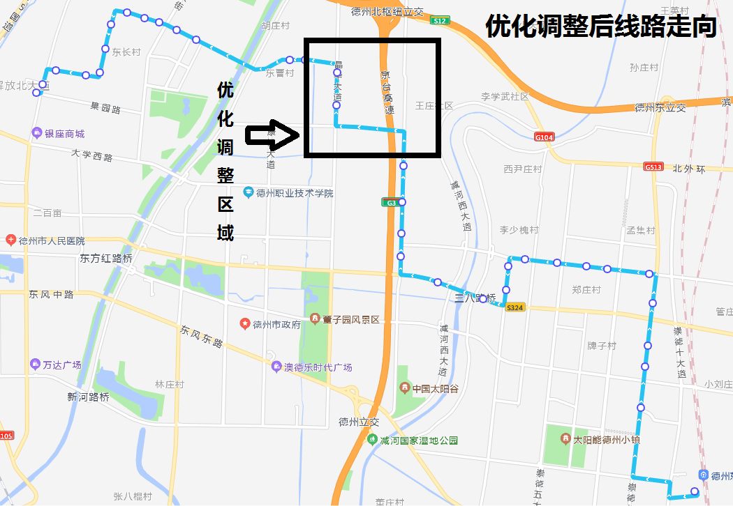 優(yōu)化調(diào)整后線路走向:車輛從德州天虹廣場站發(fā)車,行駛果園路、湖濱大道、盛園路、德興大道、萱蕙路、晶華大道、果園路、崇德一大道、天衢東路、崇德八大道、尚德十一路、崇德十大道至德州東站,返程亦同。