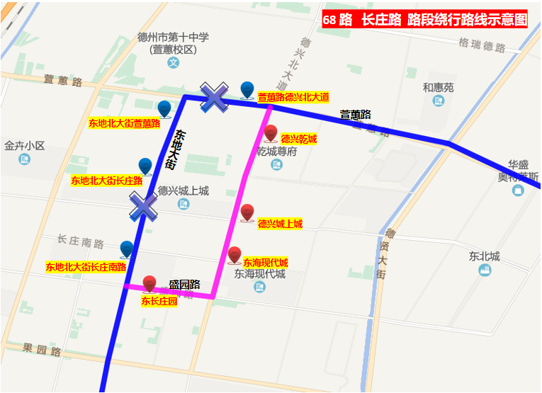 因東地大街與長(zhǎng)莊路交叉口以北路段道路施工,即日起,68路線臨時(shí)繞行,具體如下: