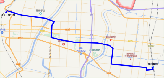 運營路線:公交三分公司、陵西路、大學(xué)西路、廣川大道、東方紅東路、崇德三大道、尚德十一路、崇德十大道、德州東站,返程亦同;