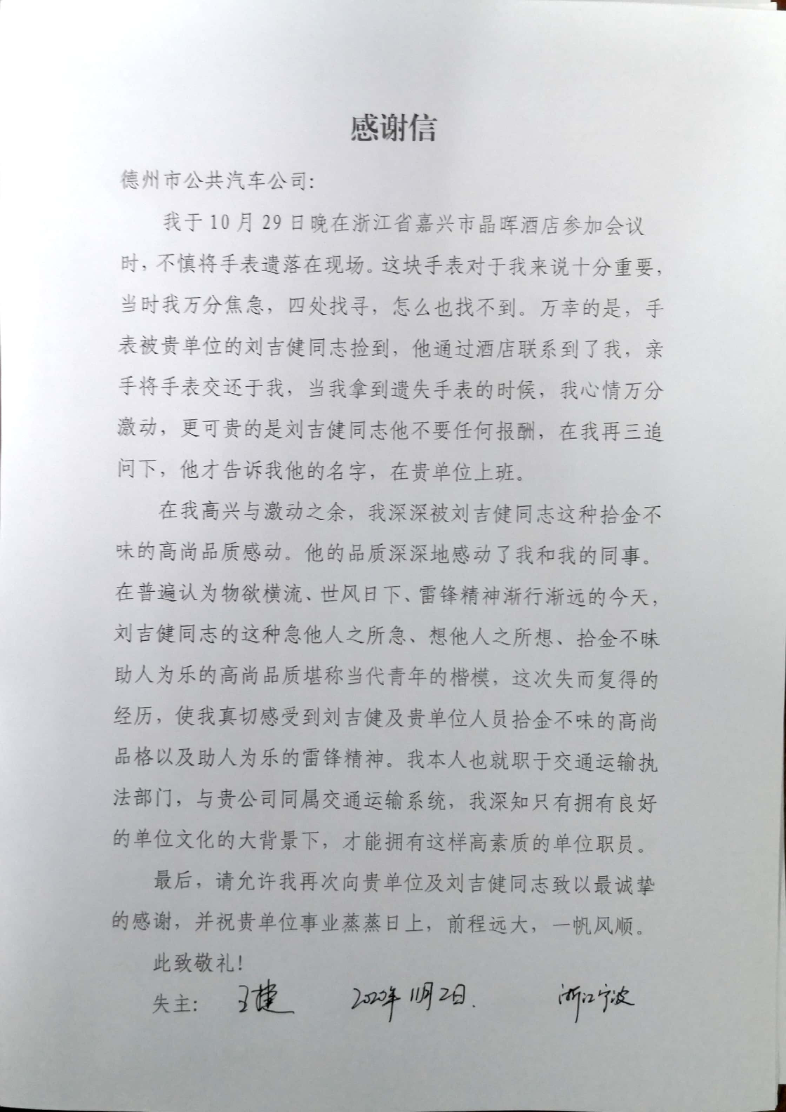 從德州到寧波,距離長(zhǎng)達(dá)1000余公里,一南一北兩座城市的人,卻因一次拾金不昧拉近了距離,11月2日,公司收到來(lái)自寧波市民的一封感謝信,這份千里迢迢發(fā)來(lái)的感謝信寄托了一份對(duì)公交職工拾金不昧的精神褒獎(jiǎng)。