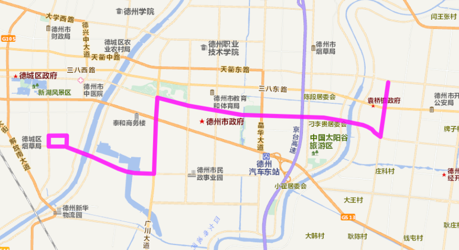 袁橋公交樞紐中心、崇德三大道、東方紅路、廣川大道、新河路、東地南大街、德州萬達(dá)廣場(chǎng)北站。