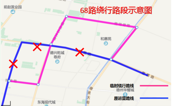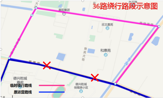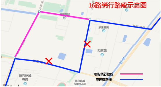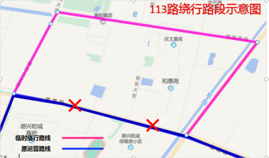 因萱蕙路雨污分流工程施工,道路封閉,不具備通行條件,即日起,公交16路、36路、68路、113路運營路線進行臨時調整,具體如下: