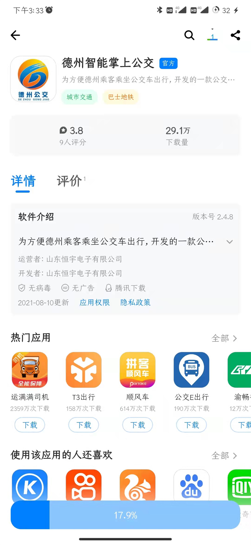 2.打開應用寶,搜索“德州智能掌上公交”進行安裝;