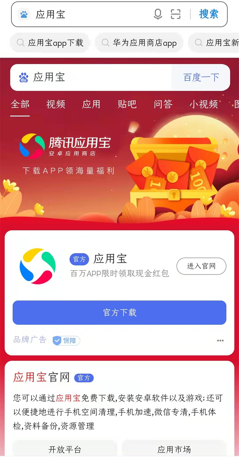 1.請在手機瀏覽器中搜索安裝“應用寶”;