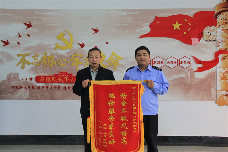 10月6日下午,梁先生再次來到公交一分公司辦公室,送上一面錦旗表示對(duì)駱春紅拾金不昧精神的感謝,同時(shí)為服務(wù)州城的公交人點(diǎn)贊。