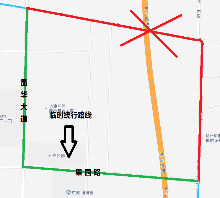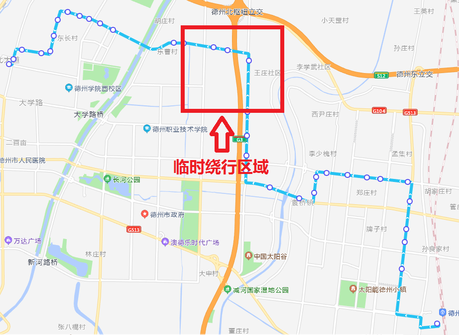 113路:由德州天虹廣場發(fā)車,沿原線路運行至晶華大道后向南至果園路,沿果園路運行至崇德一大道,恢復(fù)原線路運行。臨時取消中通市政、紅都路嶗山路、王莊社區(qū)、崇德一大道果園東路4站。