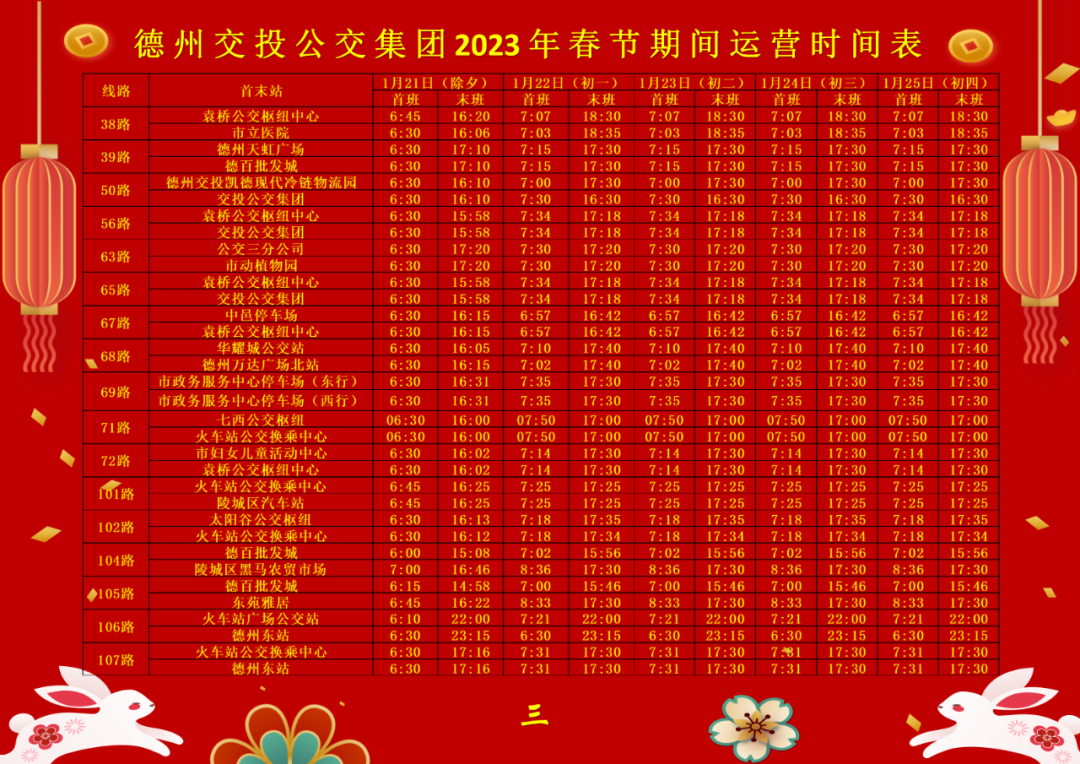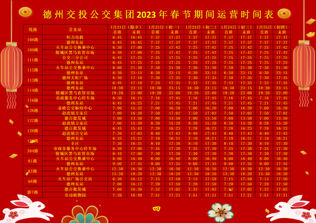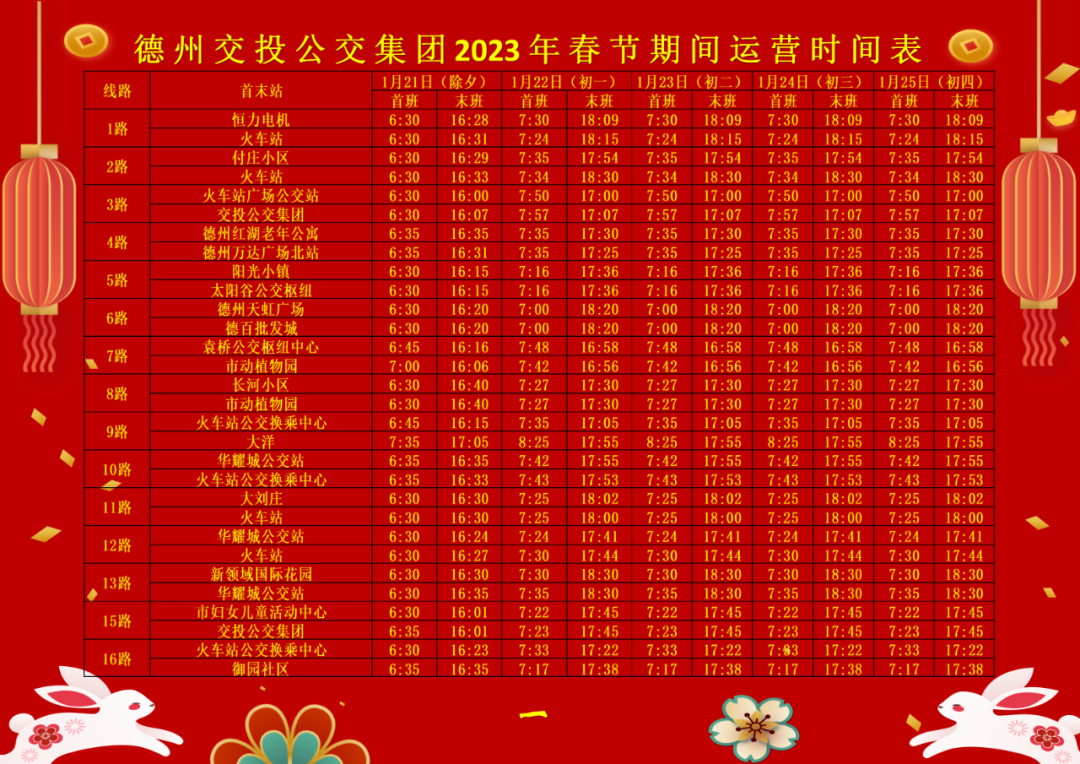 春節(jié)將至,結(jié)合居民出行情況,德州交投公交集團將于2023年1月21日(農(nóng)歷除夕)-1月25日(正月初四)對公交線路運營時間進行適時調(diào)整,具體如下:
